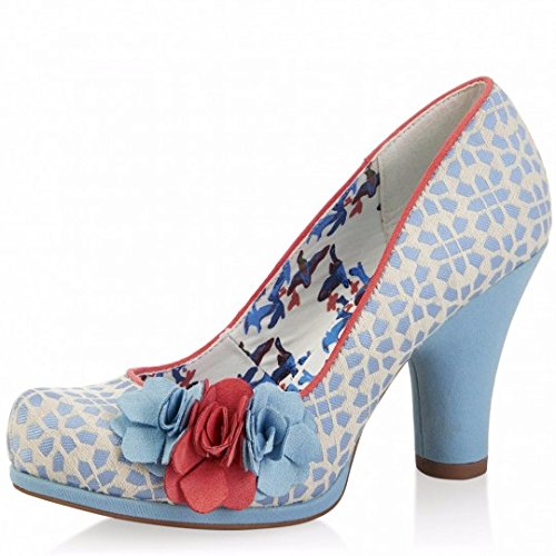 Ruby Shoo Eva women's fashion shoes have a pretty sky blue and cream pattern embroidered fabric upper with a coral colour trim. Ruby Shoo Eva court shoes also feature a subtle platform, circular shape sky blue high heel and stylish almond shape toe. The triple flower side corsage features two sky blue flowers and a central coral flower which adds a pop of colour. These fashion shoes also have a vintage inspired bird print fabric shoe lining and a rubber sole that provides good grip. Brand: Ruby Shoo Style: Eva womens high heel flower court shoes Colour: Sky Blue Heel: 3.75 inch Platform: 0.25 inch Toe: Almond Material: Fabric upper Fastening: Slip on
